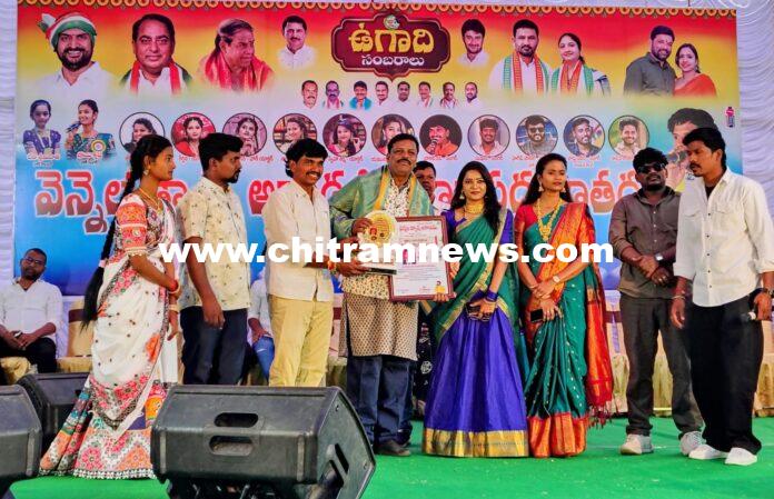 చిత్రం న్యూస్ నిర్మల్ : నిర్మల్ కు చెందిన ప్రముఖ పద్యకవి, వ్యాఖ్యాత, సంస్కృతభాషా ప్రచార సమితి ఆదిలాబాద్, నిజామాబాద్ ఉమ్మడి జిల్లాల వ్యవస్థాపక అధ్యక్షులు డా.బి.వెంకట్ వెన్నెల డ్యాన్స్ అకాడమీ ఆధ్వర్యంలో పరాభవ నామ సంవత్సరం సందర్భంగా నిర్మల్ లో నిర్వహించిన ఉగాది జానపద జాతర కార్యక్రమంలో వెన్నెల డ్యాన్స్ అకాడమీ డైరెక్టర్ ఎక్కొండ ధన్ రాజ్ యూ ట్యూబ్ సింగర్స్ చాగటి రవి, సుమన్, హరీశ్, యాక్టర్స్ -స్పేహాశర్మ, కీర్తి, నాగలక్ష్మి, డింపుల్ మౌనిక, యమున, తారక్ చేతులమీదుగా ఉగాది జాతీయ స్థాయి కళారత్న పురస్కారాన్ని స్వీకరించారు. నిర్మల్ పురపాలక సంఘం చైర్మన్ అప్పాల కావ్య, వైస్ చైర్మన్ అప్పాల గణేశ్ చక్రవర్తి, మాజీ మంత్రి అల్లోల ఇంద్రకరణ్ రెడ్డి, పారిశ్రామిక వేత్త అల్లోల మురళీధర్ రెడ్డి వెంకట్ ను అభినందించారు. ఆధ్యాత్మిక, సాంస్కృతిక, సాహిత్య కళా సామాజిక సేవలకు గుర్తింపుగా ఈ అవార్డును పొందినట్లు వెంకట్ చెప్పారు.