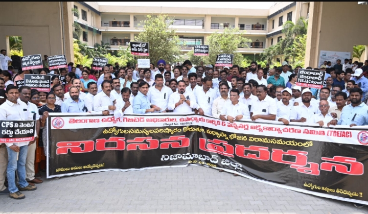 చిత్రం న్యూస్, నిజామాబాద్ బ్యూరో: దీర్ఘకాలికంగా పెండింగ్ లో ఉన్న తమ సమస్యలను పరిష్కరించాలని కోరుతూ ఉద్యోగులు నిరసన కార్యక్రమాన్ని చేపట్టారు. జూన్ రెండు లోగా పీఆర్ సీని అమలు చేయాలని డిమాండ్ చేశారు. రాష్ట్ర కమిటీ పిలుపుమేరకు ఉద్యోగులు భోజన విరామ సమయంలో కలెక్టరేట్ కార్యాలయం ఎదుట శుక్రవారం నిరసన చేపట్టారు. తెలంగాణ ఉద్యోగ, గెజిటెడ్ అధికారుల, ఉపాధ్యాయుల, కార్మిక, పెన్షనర్ల ఐక్య కార్యాచరణ కమిటీ రాష్ట్ర కమిటీ పిలుపుమేరకు, టీజీఈ జేఏసీ జిల్లా చైర్మన్, టిఎన్జీవో జిల్లా అధ్యక్షులు నాశెట్టి సుమన్ కుమార్ అధ్యక్షతన… నిజామాబాద్ కలెక్టరేట్ సమీకృత కార్యాలయ ఆవరణలో, నల్ల బ్యాడ్జీలు ధరించి, నిరసన కార్యక్రమాన్ని నిర్వహించారు. ఈ నిరసన కార్యక్రమానికి రాష్ట్ర అడిషనల్ సెక్రటరీ జనరల్ పులగం దామోదర్ రెడ్డి ముఖ్యఅతిథిగా హాజరై మాట్లాడుతూ… తెలంగాణ ఉద్యమ అనంతరం 10 సంవత్సరాల తర్వాత ఉద్యోగుల సమస్యలపై ఉద్యమించుటకు, ఎంప్లాయిస్ జేఏసీ రాష్ట్ర చైర్మన్ మారం జగదీశ్వర్, సెక్రటరీ జనరల్ ఏలూరీ శ్రీనివాస్ రావు అధ్యక్షతన, 206 పైగా భాగస్వామ్య సంఘాలతో టీజీ ఈ జేఏసీ ని స్థాపించి, పలుమార్లు 69 పైగా డిమాండ్లపై రాష్ట్ర ప్రభుత్వానికి వినతి పత్రాలు అందజేసినప్పటికీని, ఏర్పాటైన రాష్ట్ర ప్రభుత్వం, ఉద్యోగుల సమస్యలను పెడచెవిన పెట్టడం వల్ల, ఉద్యమ కార్యచరణను ప్రకటించిన నేపథ్యంలో…ఇదివరకే ప్రభుత్వానికి నివేదించిన 69 డిమాండ్ లో అతి ముఖ్యమైన నాలుగు డిమాండ్లలో మొదటిది, పీ ఆర్ సీ కమిటీ వేసి 30 నెలల గడుస్తున్నప్పటికిని నేటికి నివేదిక తెప్పించుకోకపోవడం విడ్డూరమని అయన అన్నారు. అతి త్వరగా 51% శాతం ఫిట్మెంట్ తో, 2 వ పిఆర్సిని, అమలు చేయాలనిరెండవది ఉద్యోగులకు 13 వేల కోట్లకు పైగా బకాయి పడ్డ పెండింగ్ బిల్లుల అన్నింటిని ఏక మొత్తంగా విడుదల చేయాలని మూడవది అతి ముఖ్యమైనది ఉద్యోగులకు కొత్త హెల్త్ ఇన్సూరెన్స్ విధానాన్ని అమలు చేస్తూ, ఆరోగ్య కార్డులను అమలు చేయాలని