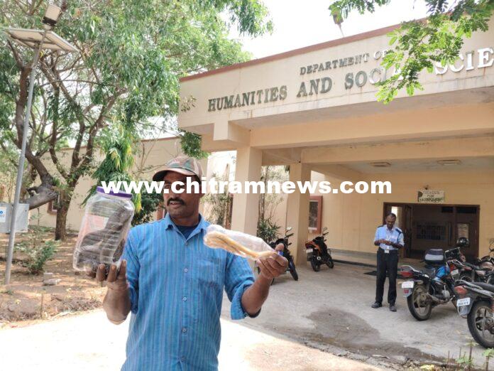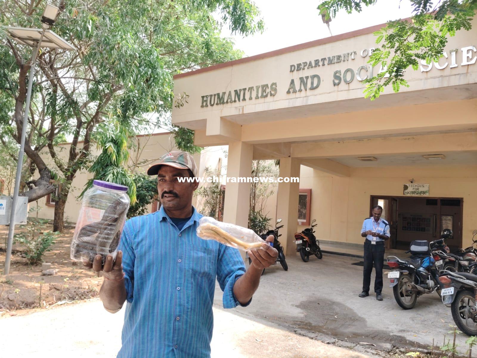 చిత్రం న్యూస్, బాసర : నిర్మల్ జిల్లా బాసర ఆర్జీయూకేటీ కళాశాల పరిసరాల్లో కొండచిలువ కలకలం రేపింది. చుట్టూ చెత్త, పిచ్చి మొక్కలు, పుట్టలు ఉండడంతో ఈ కాలేజీ పాములకు కేరాఫ్‌గా మారింది. కళాశాలలో వివిధ రకాల చెట్లు బారీగా పెరగడంతో పాములు, కొండచిలువవలకు ఆవాసంగా మారింది. హ్యుమానిట్స్ బిల్డింగ్ ప్రాంగణంలో పాము కలకలం రేపడంతో అక్కడే విధులు నిర్వహిస్తున్న రాము స్పందించి రెండు పాములను పట్టుకున్న తర్వాత వాటిని సురక్షితంగా గోనె సంచిలో పెట్టి కళాశాలకు దూరంగా అటవీ ప్రాంతంలో విడిచిపెట్టడంతో సిబ్బంది విద్యార్థిని, విద్యార్థులు ఊపిరి పీల్చుకున్నారు.