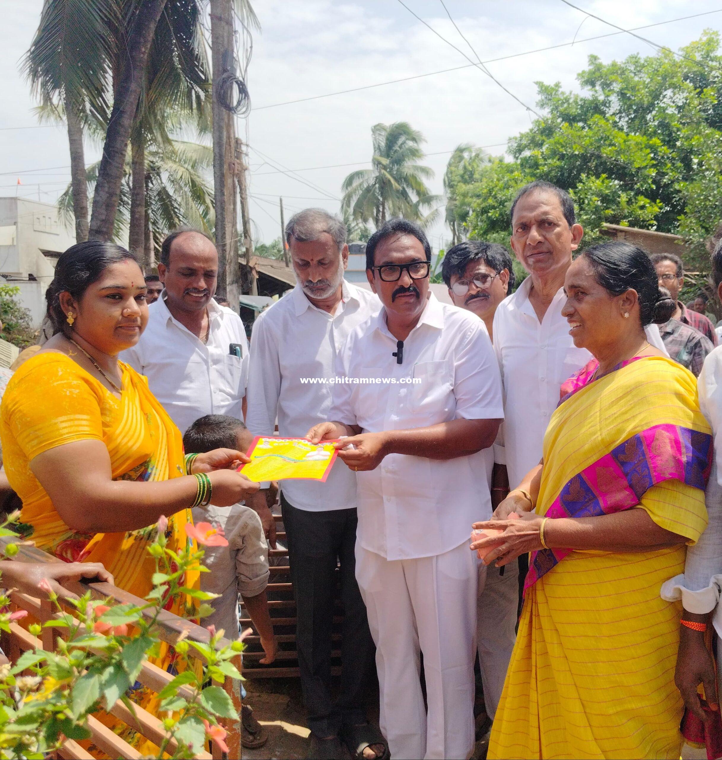 కరపత్రం అందజేస్తున్న కొత్తపేట ఎమ్మెల్యే బండారు సత్యానందరావు