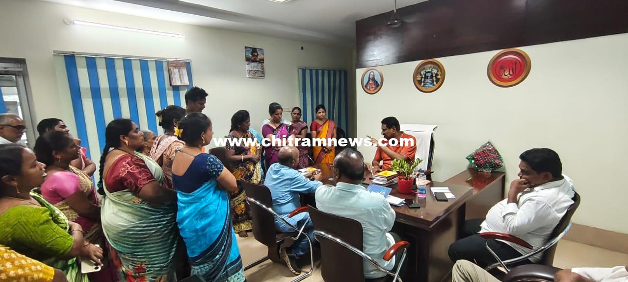 చిత్రం న్యూస్, పెద్దాపురం: కాకినాడ జిల్లా పెద్దాపురం పట్టణంలోని ఎన్టీఆర్ అపార్ట్మెంట్లో నెలకొన్న వాటర్ సమస్యను తక్షణమే పరిష్కరించాలని కోరుతూ ఆ ప్రాంత మహిళలు పెద్ద ఎత్తున మున్సిపల్ వైస్ చైర్మన్ నెక్కంటి సాయిప్రసాద్ స్వగృహంకు వెళ్ళి సమస్యను తెలియజేశారు. గత మూడు రోజులుగా వాటర్ ట్యాంకు ద్వారా మంచినీటిని పంపిస్తున్న దాహార్తితో ప్రజలు అల్లాడుతున్నారని మహిళలు వాపోయారు. మున్సిపల్ యంత్రాంగం దృష్టికి తీసుకొని వెళ్లి త్రాగునీరు సమస్యపై బోర్ వెల్ వేసేలాగ చర్యలు తీసుకుంటామని నెక్కంటి సాయిప్రసాద్ మహిళలకు హామీ ఇచ్చారు.