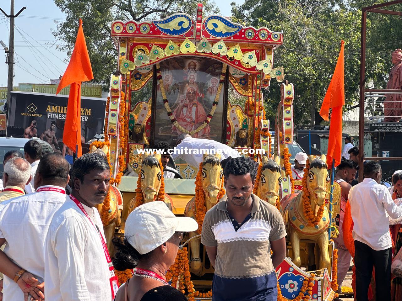 చిత్రం న్యూస్, బాసర: నిర్మల్ జిల్లా బాసర ప్రసిద్ధ పుణ్యక్షేత్రంలో జగద్గురు నరేంద్ర స్వామి పాదుక రథయాత్రను భక్తులు అంగరంగ వైభవంగా నిర్వహించారు. రామానందచార్య సాంప్రదాయ సేవ సమితి జిల్లా కమిటీ ఆధ్వర్యంలో స్వామీజీ రాకతో ప్రత్యేక పూలదండలతో భక్తులు ఘనంగా స్వాగతం పలికారు. స్వామి పాదుకలను పురవీధుల గుండా భాజా భజంత్రీల మధ్య భక్తిశ్రద్ధలతో, ఆటపాటలతో చేపట్టారు.ఈ కార్యక్రమానికి తెలంగాణ, ఆంధ్ర ప్రదేశ్,కర్ణాటక, మహారాష్ట్ర నుండి భక్తులు తరలివచ్చారు.