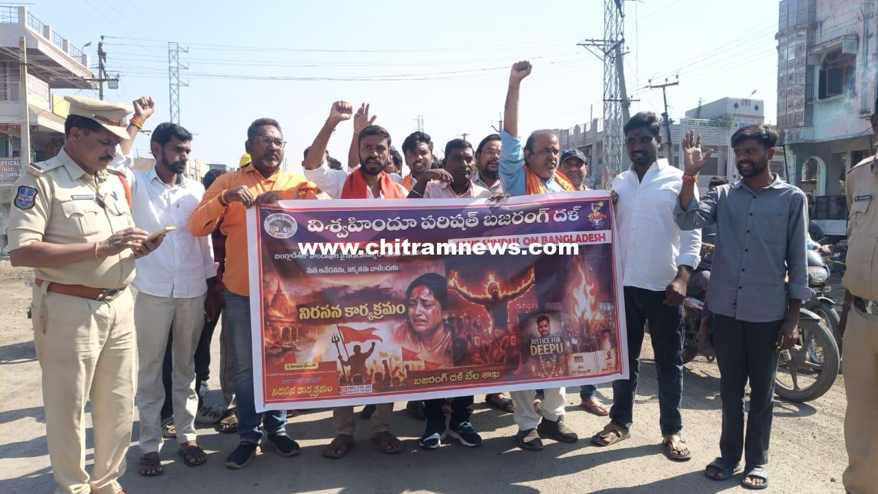 చిత్రం న్యూస్, బేల: బంగ్లాదేశ్ లో హిందువులపై జరుగుతున్న మారణ హోమాన్ని నిరసిస్తూ ఆదిలాబాద్ జిల్లా బేల మండల కేంద్రంలో బజరంగ్ దళ్, విశ్వహిందూ పరిషత్ ఆధ్వర్యంలో శనివారం నిరసన ర్యాలీ చేపట్టి శివాజీ చౌక్ అంతర్జాతీయ రహదారిపై దిష్టిబొమ్మ దగ్ధం చేశారు. ఈ సందర్భంగా బజరంగ్ దళ్ జిల్లా ధర్మ ప్రచార ప్రముఖ్ శ్రీరామ్ శర్మ మాట్లాడుతూ పలు ఇతర దేశాలలో హిందువులపై పైౖశాచికంగా ఉన్మాది చర్యలకు పాల్పడడం హేయమన్నారు. బంగ్లాదేశ్ లో హిందూ యువకుడిని పెట్రోల్పోసి తగలబెట్టడం దారుణమన్నారు. ఇటువంటి సంఘటనలను ప్రతి ఒక్కరు ఖండించాలన్నారు. ఇప్పటికైనా హిందువులంతా మేల్కొని ఐక్యంగా ఉంటూ ప్రజాస్వామ్య బద్ధంగానే ప్రతిఘటించాల్సిన అవసరం ఎంతైనా ఉందన్నారు. కార్యక్రమంలో విశ్వహిందూ పరిషత్ జిల్లా అధ్యక్షులు రాజ్ కుమార్,బజరంగ్ దళ్ మండల అధ్యక్షుడు అగర్కార్ ఆకాష్ ,నాయకులు పొత్ రాజ్ నవీన్, రాము బర్కాడే, ప్రఫుల్, గేడం ప్రవీణ్, ఓం ప్రకాష్, తరుణ్, బాలాజీ తదితరులు పాల్గొన్నారు